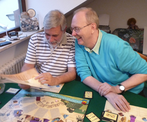 Aaron war fest davon überzeugt, dass wir das Spiel schon einmal gespielt haben. Ganz deutlich konnte er sich an Spielbrett und Material erinnern. Doch in unseren Archiven fand er keinen Hinweis darauf. Auflösung: Auf der Spiel 2012 in Essen hatte er am Stand von „White Goblin Games“ zugesehen oder mitgespielt.