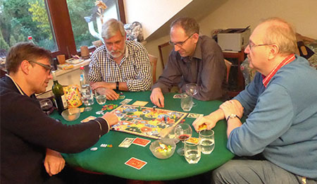 Erst beim Abräumen fiel unser Blick auf die empfohlene Variante, in der nicht alle Ausbaukarten von Beginn an offen ausliegen. Also wurde noch ein zweiter Durchgang gestartet. Gefühlt war man jetzt noch etwas abhängiger vom Glück, weil man auch noch der Option der Planung seiner Aufbaustrategie beraubt wurde. Aber unser Mathematiker Günther erklärte, dass diese Variante durch die Erhöhung der Zufallseffekte eher ausgleichend wirkt. Wie auch immer, nur er fand das Spiel mit dieser Variante etwas besser.
